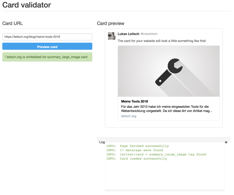Mit dem Card Validator werden jetzt ohne Probleme die Metadaten auf der Website ausgelesen und Twitter kann die Twitter Cards anzeigen.