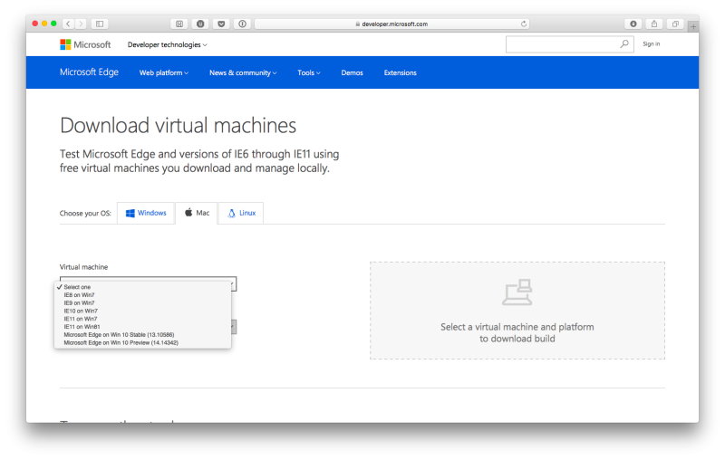 Wenn man auf ältere Versionen des Internet Explorers zurückgreifen muss, wird es etwas schwieriger, da man die entsprechende Version vermutlich nicht zur Hand hat. Ich staunte nicht schlecht als ich die Seite von Microsoft entdeckt habe, auf der man die unterschiedlichsten VMs mit dem Internet Explorer laden kann.