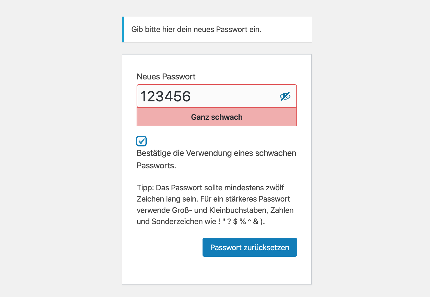 WordPress zeigt beim Anlegen eines Passworts die Stärke des Passworts an. Jedoch kann der Benutzer dies mit einem Haken ignorieren. (Sollte man natürlich nicht tun.)