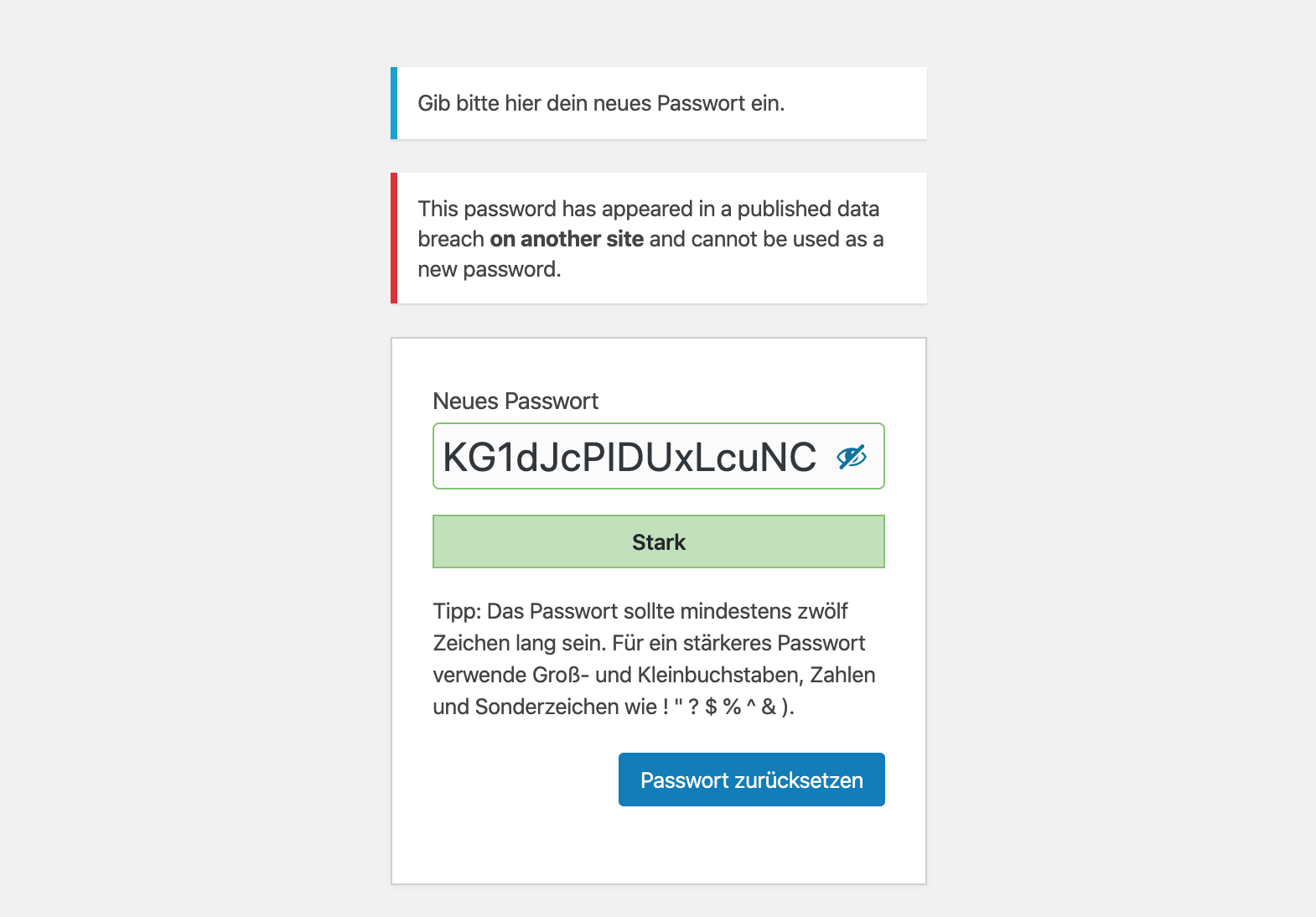 Um sicherzustellen, dass kein Passwort verwendet wird, das schon mal veröffentlicht wurde, kannst du das Plugin Passwords Evolved installieren. Das Plugin gleicht das von dir gewählte Passwort mit der Plattform Have I been pwned? ab. Dabei wird dein Passwort natürlich nicht im Klartext übertragen. Vor der Übertragung wird das Passwort in ein Hash umgewandelt und dann werden nur die ersten 5 Zeichen des Hashes an die API geschickt. Die API liefert eine Liste an möglichen Passwörtern, die mit dem gleichen Hash anfangen. Die eigentliche Überprüfung passiert in dem WordPress-Plugin. Die Technik nennt sich k-anonymity.